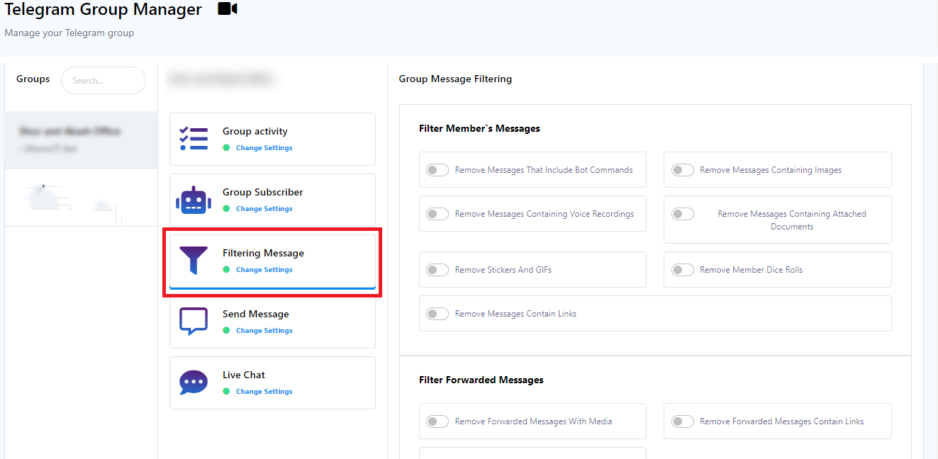 The `Filter Forwarded Messages` feature offers you the capability to control and manage forwarded messages within your group. This feature provides the following options: